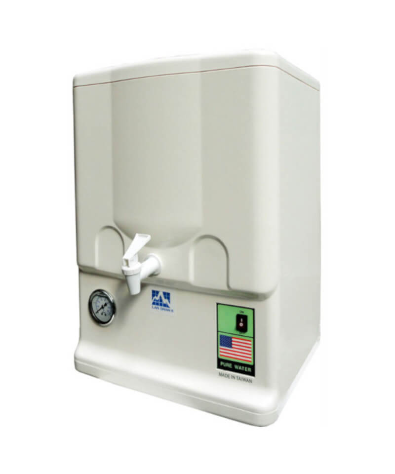 Lanshan counter top wall mount RO water purifier. Per day capacity 250 liters. Original Taiwan brand. The purifier contains a built in 15 liters reserve tank that ensure 100% pure water for your office or home.